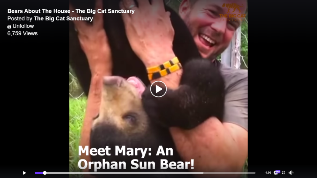 Mary the Sun Bear was rescued by Free the Bears after her mother was killed in the wild and was spotted on the back of a truck to be sold into the illegal wildlife trade. She now lives with Giles and Matt but needs round the clock care. Mary was found very malnourished and fragile, and desperately needed the care from the sanctuary.