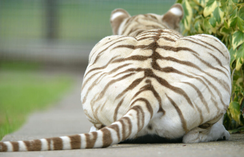 Evening guests would giggle at the sight which greeted them as they walked into the tiger house at the end of a feed day, faced with an enormous and famously slow eating Tamair who would have brought his meal to bed and put it directly in front of Narnia. Every time Narnia would be laid sprawled upside down on the floor where their dens adjoined, staring at Tamair and begging for him to hand his entire meal over to her. Always, of course, he would keep it for himself and eat it tantalisingly slowly in front of her, and always she would lay there in hope having already devoured the meal of her own!
